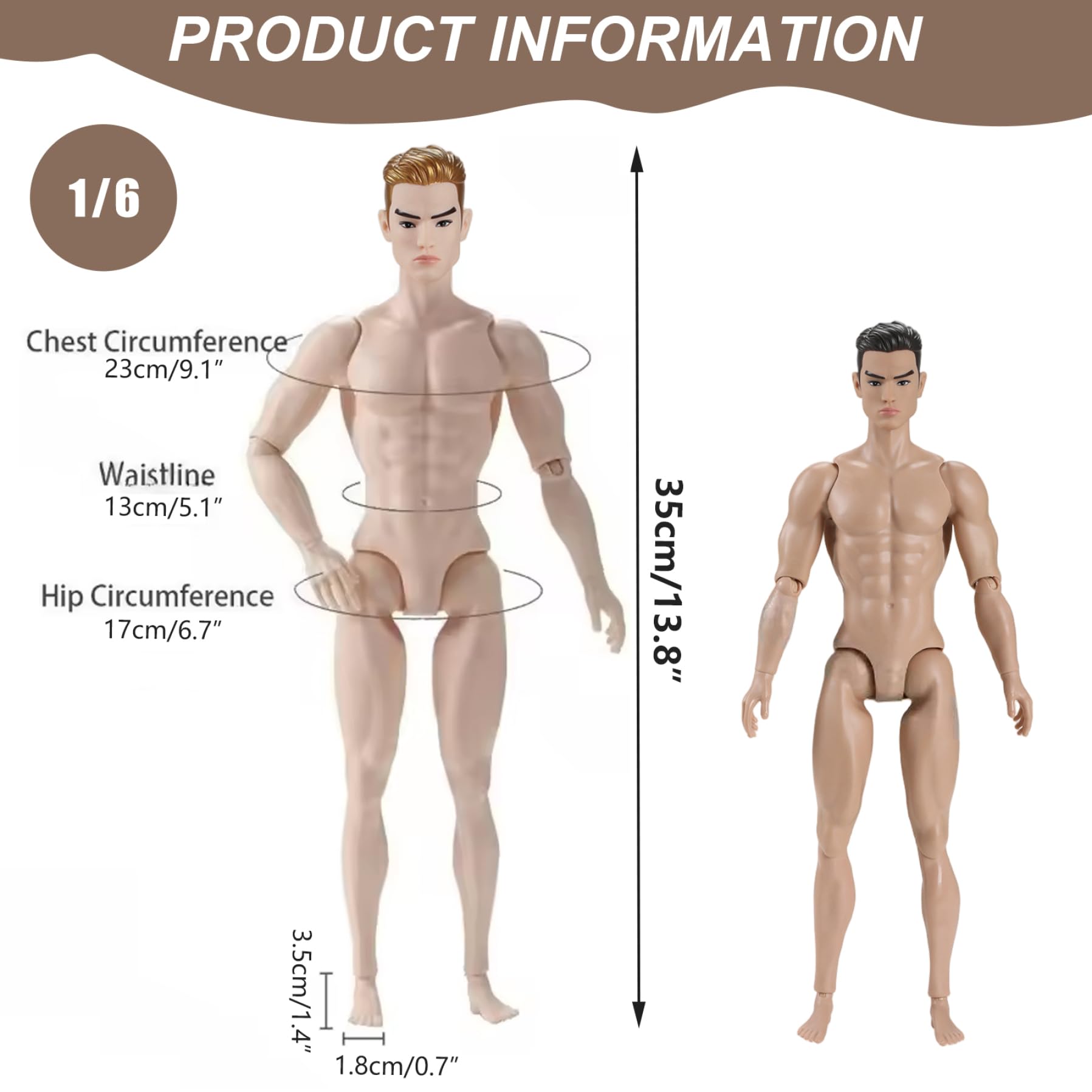 Perfect Scale for Display: Standing at 6 inches tall with a 1/6 scale, this figure is compatible with many existing action figure collections and accessories, making it a versatile addition to any display. Descripción del producto Description: This 1/6 Scale Action Figure, 6 Multi Jointed Movable Male Muscular Action Figure Body for Display Collection offers collectors and customizers a versatile, detailed figure that stands out with its highly articulated joints for realistic movement and dynamic posing, a muscular and finely sculpted physique that adds authenticity, and a blank design ideal for custom action figures, allowing users to personalize and create unique characters; made from materials to endure extensive handling, it ensures longevity, and its perfect 6-inch height at 1/6 scale makes it compatible with a wide range of accessories and collections for seamless display and integration., Features:., -Color: Light Brown., -Material: PVC + PP. Note:Manual measurement, please allow slight errors on size. Muscular Physique Detail: The figure body showcases a finely sculpted muscular build that enhances visual appeal, providing an authentic and powerful look for display or customization projects. Perfect Scale for Display: Standing at 6 inches tall with a 1/6 scale, this figure is compatible with many existing action figure collections and... -Size: Chest Circumference: 23cm/9., 06inch., Waistline: 13cm/5., 12inch., Hip Circumference: 17cm/6., 69inch., Feet: 3., 50x1., 80cm/1., 38x0., 71inch., Height: 31cm/12., 20inch., -Weight: 158g. Figura PVC 31 Cm Articulada 1/6 Scale Male Body,12inch Male Flexible Strong Muscular Action Figure Body Doll Collection (A Figura De Acción 1/6 Musculada 1/6 Scale XXL Olive Green Boxer Briefs Trunks Men's Underwear On A Tbleague Phicen M34 Muscular Action Figure Doll Body The colors may exist slight difference due to different screens.